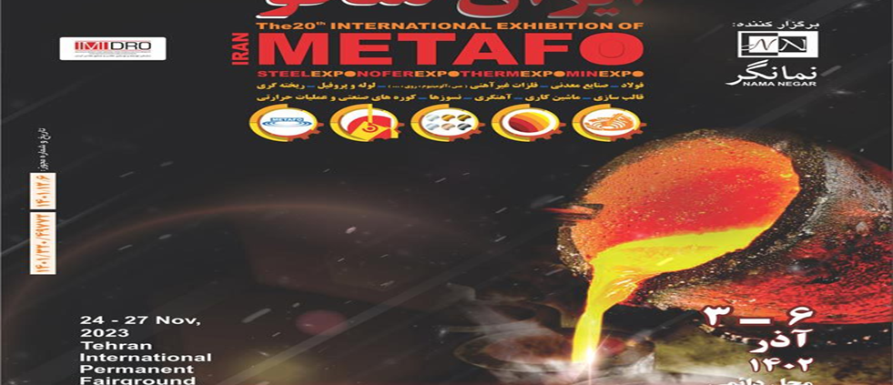 بیستمین دوره نمایشگاه بین المللی متالوژی (ایران متافو2023) در تاریخ 3تا6 آذر ماه سال 1402 در محل دائمی نمایشگاه های بین المللی تهران از ساعت 8صبح لغایت 15 بعد از ظهر برگزار گردید و فعالان و صاحبنظران امر در محیطی تخصصی و تجاری گرد هم آمدند. این نمایشگاه با استقبال گسترده ی فعالان داخلی و بین المللی برگزار شد شرکت های معدنی و صنعتی داخلی و بین المللی محصولات، قابلیت های فنی و نوآوری های خود را به بازدیدکنندگان عرضه داشته و از تعامل با دست اندرکاران و فرصت های موجود بهره بردند.